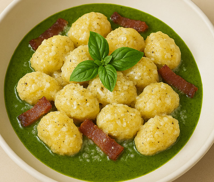 Mettere a bollire l’acqua, intanto in un contenitore dai bordi alti versare la rucola, l’olio EVO, qualche cucchiaio di acqua bollente e 10 g di Grattugiato Gourmet Cacio e Pepe, frullare con minipimer ad immersione. Salare e tenere da parte. In una padella tostare il guanciale a listarelle finché il grasso non diventa trasparente, tenere da parte. Cuocere gli gnocchi per il tempo necessario, scolare nella padella con il guanciale, mantecare con Grattugiato Gourmet Cacio e Pepe. Impiattare versando sul fondo del piatto la salsa di rucola e sopra gli gnocchi mantecati. Servire con un filo d’olio fresco e qualche foglia di basilico fresco.