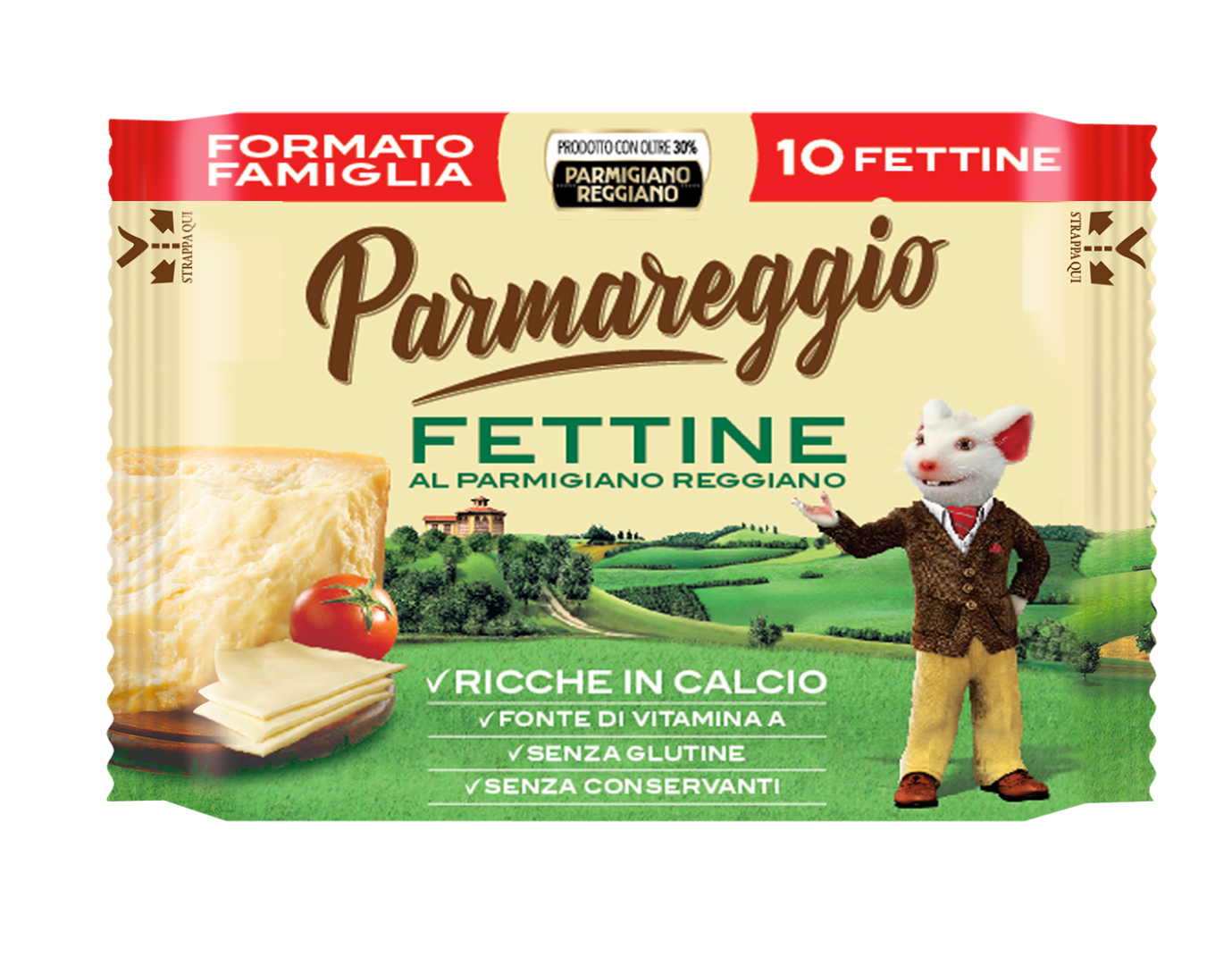 Le Fettine al Parmigiano Reggiano, prive di conservanti e polifosfati aggiunti, sono perfette per arricchire ogni ricetta con il loro gusto pieno e deciso e la loro morbidezza e genuinità. Le Fettine Parmareggio sono nobilitati dalla straordinaria naturalità e genuinità del Parmigiano Reggiano, presente al 30% come primo ingrediente ed unico formaggio in ricetta.
